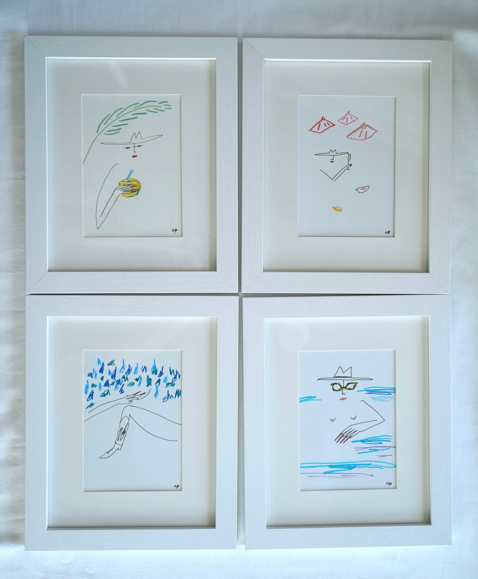Each painting is a one of one original made with watercolor, ink, pastel, charcoal and metallic gouaches. Artwork is 5x7 matted in a white 8x10 frame ready to hang in your home